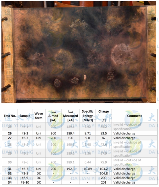 本次測試標(biāo)準(zhǔn)IEC61400-24,能量10MJ,電流20萬安培,測試制板完全模擬國內(nèi)風(fēng)電主流使用的鋪貼工藝和層間結(jié)構(gòu)。令人欣喜的是,進行實驗的317gsm鋁網(wǎng)和420gsm銅網(wǎng)在經(jīng)歷三次短波、三次長波沖擊后,都有效的保護了層間結(jié)構(gòu),并在傳導(dǎo)區(qū)域沒有出現(xiàn)任何熔斷或斷裂,達(dá)到了一級防雷的效果。實驗報告結(jié)果附下。