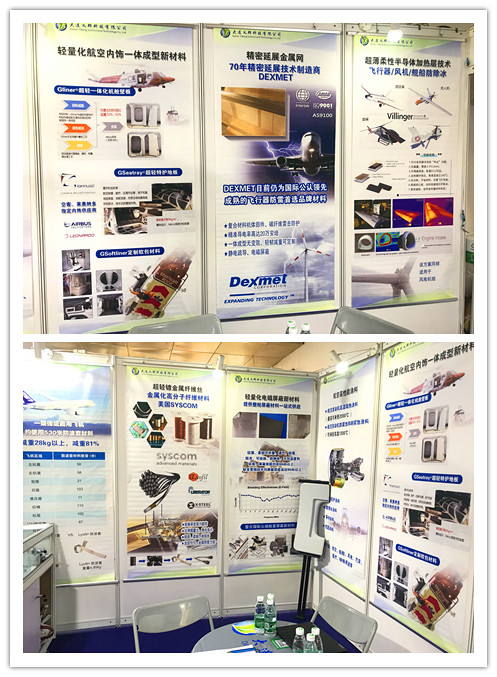 本次北京SAMPE材料展,大連義邦以航空新材料為定位,優(yōu)選國際領(lǐng)先、國內(nèi)空白的高精尖多款高性能材料,如用于航天線纜的SYSCOM超輕金屬化高分子纖維絲,飛行器雷擊防護(hù)的DEXMET精密延展金屬網(wǎng)、防除冰半導(dǎo)體柔性加熱層、引領(lǐng)國際先進(jìn)直升機(jī)機(jī)型的輕量化一體式機(jī)艙內(nèi)飾壁板、地板,高屏效輕量化整艙電磁屏蔽材料、航發(fā)高溫防腐涂料等。
