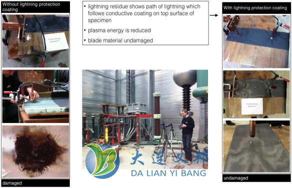 奧地利Villinger 經(jīng)過十幾年的努力成功研發(fā)出新型的雷擊防護產(chǎn)品,防雷擊涂料在很大程度上降低了維修成本,操作簡便與面漆涂覆工藝相近,干燥后重量約25g/㎡,不改變?nèi)~片氣動性能,無需取下葉片,完全適合高空作業(yè),是已建風場改造方案的最佳選擇。